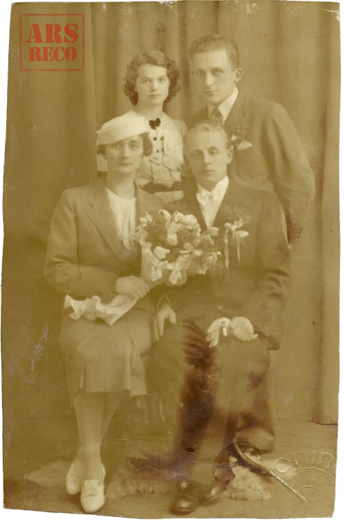 I assume this is a wedding photo. My grandmother Zofia and my grandfather Józef Pomykała are in the foreground, behind them stand witnesses – persons unknown and, despite attempts at comparisons, unrecognized in other extant photographs (although my wife suspects that the standing man is also immortalized in photograph number 9). The picture was taken in the photographic studio “Janina” in Krakow. We have not been able to find any information about this studio (the currently existing Kraków Foto-Studio “Janina” was established long after the war). It is safe to say that this photograph dates back to 1938, because thanks to the help of Your Roots in Poland we found out that my grandparents got married on February 13, 1938