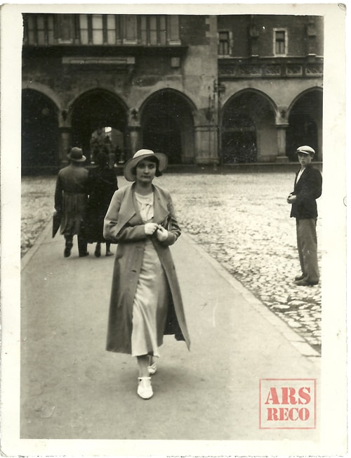 The photo shows my elegant grandmother, Zofia Pomykała, with a no less elegant few-year-old girl wearing gloves and carrying her own handbag, which my wife pointed out to me. I don’t know who this girl is; she looks like her grandmother, maybe she’s a relative. The photo was taken at St. Mary’s Square, overlooking St. Barbara’s Church and tenement house number 7. An incomplete inscription can be seen above the grandmother’s head, but it was fairly easy to read. This is the signboard of the shop “Porębski i Zimler” at Rynek Główny 8 (sometimes interchangeably 7), where before the war there was a “small goods store”, offering underwear, among other things. This was the appearance of the signboard between 1937 and 1939. Comparing Grandma’s clothing to the one she is wearing in photograph number 14, one might venture to say that these are the summer months of 1938.