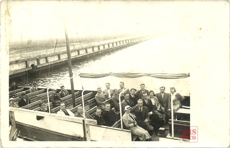 However, my wife and I persisted in finding the name of this unit. Firstly, we discovered that in Gdynia in the second half of the 1930s the tycoon of passenger motorboats carrying tourists around the Gdynia harbour was Robert Wilke. Secondly, we came across a forum where Polish ships of intra-port communication were discussed based on Jerzy Micinski’s Book of Polish Ships: 1918-1945. The names of the units and their parameters, including length, width, and maximum number of passengers carried, are given after this book. In my postcard and those found on Allegro, although only part of the motorboat is photographed, you can see that it would fit 72 people in twelve rows of benches. So in terms of the number of passengers and the width of the motorboat only “Gryf” belonging to the company “Robert Wilke – Motorówki Pasażerskie” matched. Other vessels of similar width took fewer passengers on board, while those that took similar or more tourists were too wide and had three rows of benches. Unfortunately, there is only one poor quality photo of Robert Wilke’s fleet available on the internet, in which the “Gryf” is somewhat obscured by other vessels. In the book Gdynia and the Sea, published in 1938 by the shipowner himself, apart from the photograph we already know, Wilke himself did not boast about his ships. But my attention was drawn by the cover of the book, where, in my opinion, the illustrator quite faithfully rendered the figure of “Griffin”. With that, I tried to calculate the length of the craft and the approximate number of passengers. Thus, assuming that the racks of the tarpaulin are distant from each other by around 1. 5 m and there are probably twelve of them, while the bow deck occupies almost ⅓ of the length, I calculated that the motorboat visible on my postcard may have the length of ,,Griffin” (i. e. 24. 2 m). Also assuming that between the frames there are two rows of benches accommodating twelve persons, the number of rows will be 22, six persons in each (in the last row at the stern seven persons will sit due to the lack of passage between the benches), so the total number of persons will be 133 – and this is the maximum number of passengers of “Gryf” given in the mentioned Book of Polish ships. The motorboat entrance visible in my photo is probably located in the middle of the passenger pad. I hope to be able to confirm this conjecture at some point.
