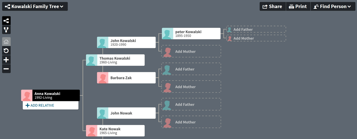 Sposób wprowadzania danych do budowanego drzewa jest bardzo intuicyjny. Fakty dotyczące kolejnych osób wyświetlane są zarówno na wykresie, jak i w ramach podstron związanych z poszczególnymi członkami rodziny. Poniżej przykład drzewa genealogicznego tworzonego na ancestry.com: