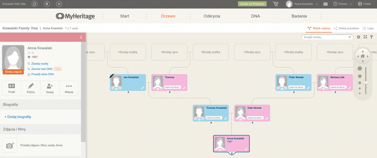Wersja podstawowa daje możliwość wprowadzenia do 250 osób na drzewie. Co prawda i jak wspomniano powyżej występuje tu funkcja smart matches, jednak bez wykupienia wersji premium nie jesteśmy w stanie skontaktować się z administratorem drzewa, z którym mamy połączenia. Abonament jest roczny, a ceny to do około 10 USD/miesiąc. My heritage posiada swoją wersję mobilną, a także – off line, ale o tym w drugiej części artykułu.