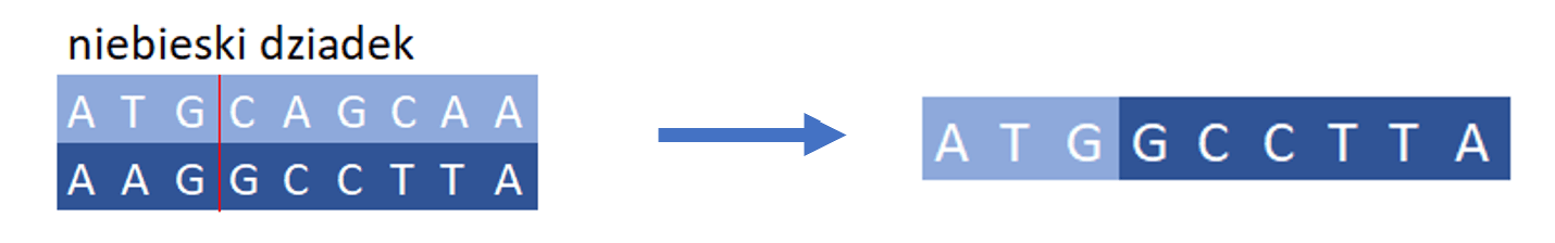 Ładnie, kolorowo i schematycznie, ale o co chodzi? Przeanalizujmy to krok po kroku. Zacznij, więc od „niebieskiego” dziadka. W procesie rekombinacji (wymiana materiały genetycznego) może dojść do crossingover. Najprościej można powiedzieć, że jest to wymiana odcinków łańcucha DNA. Na rysunku poniżej zaznaczono czerwoną linią miejsce rozczepienia genów. Część informacji znika bezpowrotnie, a dokładnie połowa. Po jednej stronie zostanie fragment „niebieski”, a po drugiej „lekko-niebieski” (innymi słowy, „literki” z górnej „linijki” po jednej stronie, a „literki” z dolnej „linijki” po drugiej stronie).