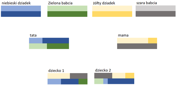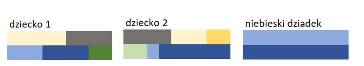 Na pierwszy rzut oka widzimy, że rodzeństwo (roboczo nazwane dziecko 1 i dziecko 2) są bardzo podobni genetycznie – tacy mocno „niebiescy”. Z drugiej strony widzimy, że rodzeństwo jednak się różni, pomimo tego, że mają tych samych rodziców, tych samych dziadków (w tym tego „niebieskiego”), tych samych pradziadków i tak dalej. Odpowiedzią jest rekombinacja. Dlaczego i co znaczy? Tak zostały nazwane procesy biologiczne sterujące dziedziczeniem. Nas jako genealogów genetycznych interesuje fakt, że pomimo tych różnic, możemy coś porównać. Po analizie okazało się, że materiał genetyczny od dziadków rekombinował w taki sposób: