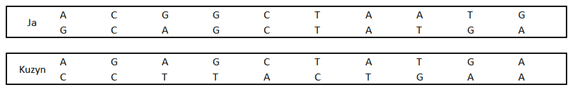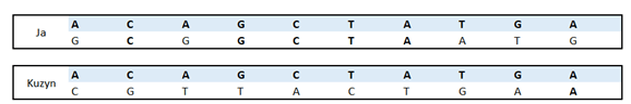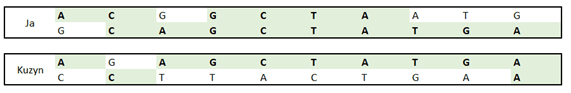 Na rysunku powyżej widzimy fragmencik wyników, które zostały rozczytane w procesie analizy DNA. Na pierwszy rzut oka widać, że oba fragmenty są różne. Jednak, jeśli weźmiemy pod uwagę fakt, że aby mówić o podobieństwie wystarczy przynajmniej jedno dopasowanie w danym miejscu u dwóch osób, to okazuje się, że te wyniki mogą należeć do krewnych, którzy odziedziczyli ten sam fragment po wspólnym przodku. Na zielono zaznaczono podobieństwa:
