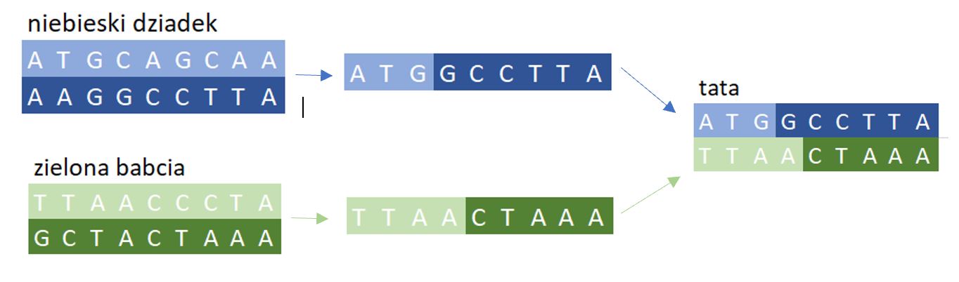 Tak powstały „pół-chromosom” jest przekazany synowi, a drugą połowę otrzymuje od „zielonej babci”.